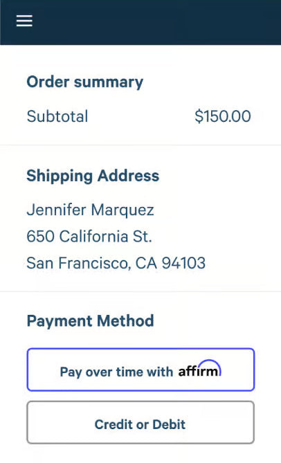 Select Affirm at checkout, then enter a few pieces of info for a real-time decision
