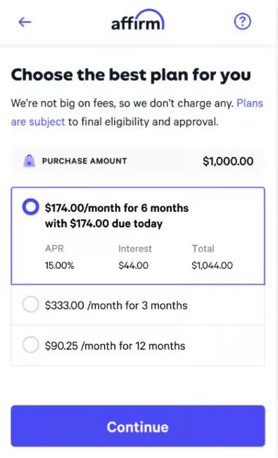 - Answer the Affirm questions, select your payment options and continue the check out process.